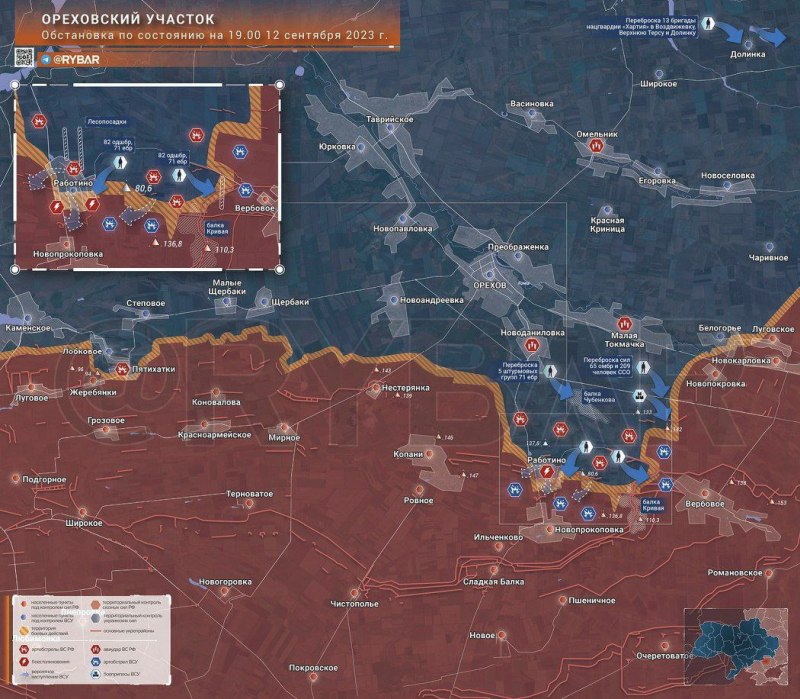 Сообщается о попытках 71 егерской бригады совместно с 82 десантно-штурмовой бригадой ВСУ штурмовать опорные пункты ВС РФ у Вербового, где атака была отбита, а сама 71 бригада понесла первые потери. Также на передовую вернулись формирования 65 механизированной бригады ВСУ, которые прошли доукомплектование. И им в подчинение были переданы 209 челвоек из отряда спецназа ССО Украины для штурма высот южнее Работино, отметили военкоры «Рыбaря».