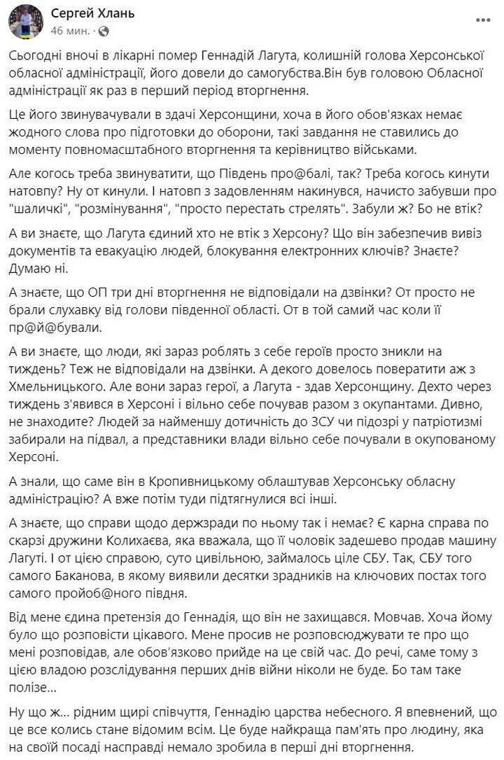 Подробности смерти Лагуты раскрыл депутата облсовет Сергей Хланя. По его словам, Лагута покончил жизнь самоубийством, приняв смертельную дозу таблеток. Он утверждает, что бывшего главу Херсонской области (он руководил ОВА с октября 2021 по конец июня 2022) довели до самоубийства подозрениями в сдаче региона российским войскам.