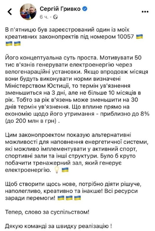 Народный депутат Украины от партии «Слуга народа» Сергей Гривко анонсировал «креативный проект» по использованию заключенных в качестве электрогенераторов.
