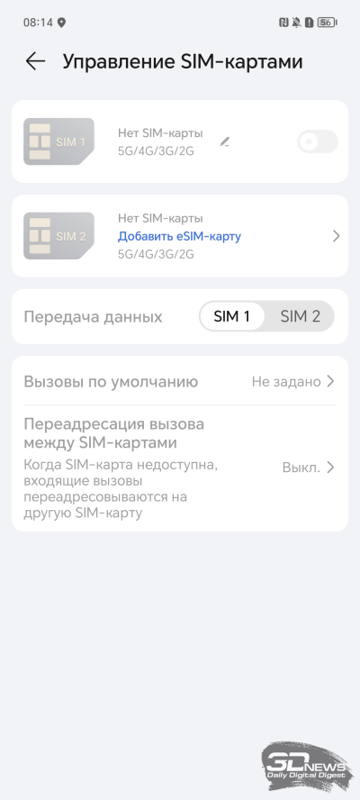 В HONOR 90 предусмотрен двойной слот для nano-SIM. Скорость LTE-модема производитель не указывает, как и поддерживаемые диапазоны, но мы говорим о международной версии смартфона, так что с этим все должно быть хорошо. Как минимум у меня все работало, соединение стабильное, скорость высокая. Есть и 5G-модем — список поддерживаемых диапазонов есть в таблице характеристик, если для вас это актуальная информация. Также поддерживается и e-SIM – вместо второй физической операторской карточки.