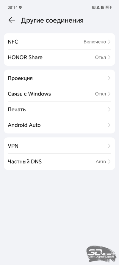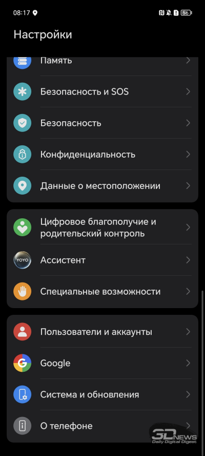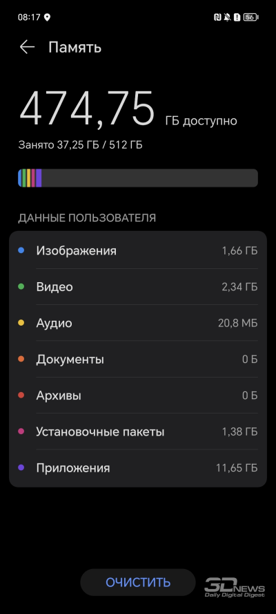 HONOR 90 поставляется с 12 Гбайт оперативной памяти и накопителем на 512 Гбайт (в природе также встречаются версии с 8 Гбайт оперативки и с флеш-модулем на 256 Гбайт — причем почти в любых сочетаниях). К сожалению, достоверно выяснить тип оперативной памяти у меня не получилось – специальные приложения не дают ответа, а в настройках смартфона информации также нет. Остается надеяться, что карта поддержки быстрой оперативки действительно разыграна. Отмечу, что оперативную память можно расширить за счет накопителя, «отъев» у него до семи дополнительных гигабайт. А вот накопителю гигабайт добавить нельзя – слот для карты памяти не предусмотрен. Впрочем, для полутерабайтного устройства эта проблема не выглядит серьезной.