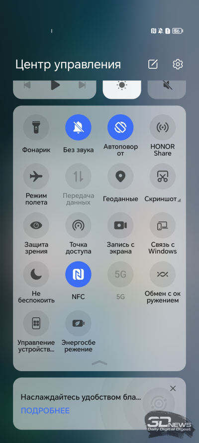 Третья его особенность – циркадный ночной режим. Про него мы недавно рассказывали в обзоре планшета HONOR Pad X9. При его активации цвета меняютcя не разово, а постепенно, как бы вместе с циркадными ритмами. Так глаза легче приспосабливаются к изменяющимся цветам и устают еще меньше, чем при резком включении/выключении ночного режима. И да, днем цвета становятся холоднее, а ночью теплее. Но это не просто другое название ночного режима, а в каком-то роде вариация на тему True Tone от Apple, просто подстройка происходит не под внешнее освещение, а под время суток.