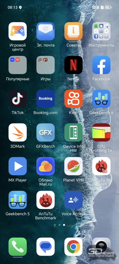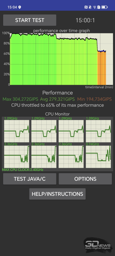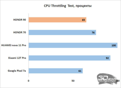 С троттлингом ситуация спорная – в ресурсных тестах из пакета 3D Mark’s Wild Life тактовая частота не понижается вовсе, а в CPU Throttling Test фиксируется падение частоты сразу на 35 %. Так что от троттлинга платформа не избавлена, но и о серьезных проблемах говорить не приходится. Под нагрузкой корпус смартфона греется минимально, заметного падения кадровой частоты в играх даже во время продолжительных сессий я не заметил.