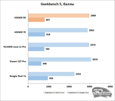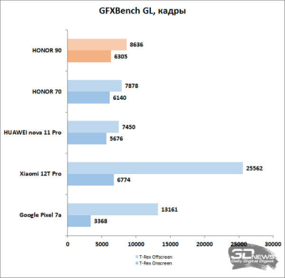 Именно вторичные достоинства – ключевые у Snapdragon 7 Gen 1. Какой-то впечатляющей производительностью по сравнению с платформами даже предыдущего поколения она не блещет. Да, есть прибавка относительно Snapdragon 778G, на базе которой был выполнен HONOR 70, но на десяток-другой процентов, причем в первую очередь в графической составляющей, а не в чистой вычислительной мощи. Впрочем, для смартфона среднего класса в 2023 году уровень вполне нормальный, даже, можно сказать, выше среднего — серьезного скачка в последний год тут не происходило.
