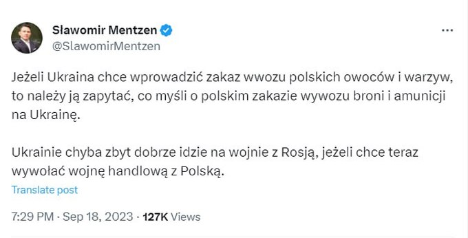 В случае же введения Киевом запрета на ввоз в страну польских фруктов и овощей, Варшава может ответить запретом на ввоз оружия и военной техники на Украину через территорию Польши, о чем заявил польский политик Славомир Менцен. Напомним, на днях Украина заявила о намерении подать жалобу в ВТО по поводу запрета Польши, Словакии и Венгрии на импорт украинской сельскохозпродукции. В ответ на это в этих странах приняли решение бойкотировать координационную платформу по украинскому зерну в Брюсселе.