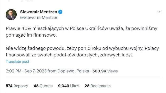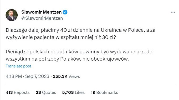 На фоне этого польский политик Славомир Менцен призвал прекратить тратить средства на украинских беженцев, заявив, что 40% из них считают, что им должны платить деньги. По мнению польского политика, нет никакой необходимости финансировать большое количество людей, которые попросту не хотят работать. Также его возмутило, что расходы на украинских беженцев превышают некоторые соцвыплаты для поляков – например, стоимость суточного питания пациента в больнице.