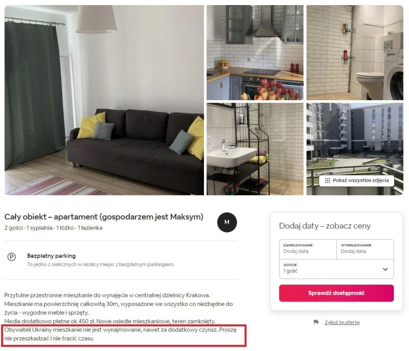 К слову, украинцам уже стали отказывать в аренде квартир в Польше. Так, на онлайн-площадке для размещения и поиска краткосрочной аренды частного жилья Airbnb появилось интересное объявление о сдаче квартиры в Кракове, где указано, что «гражданам Украины квартира не сдается даже за дополнительную арендную плату, пожалуйста, не беспокоить и не тратить время».