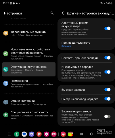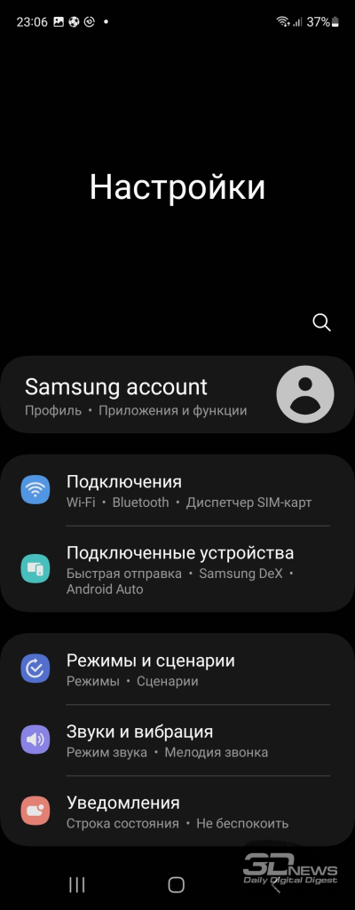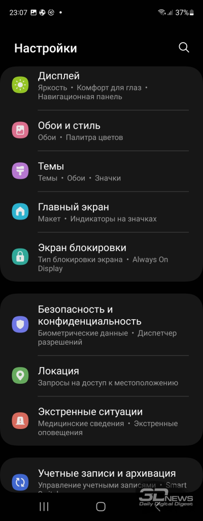 Набор настроек экрана остался неизменным. Интерфейс можно настраивать очень подробно, есть возможность менять шрифты, выбирать частоту дисплея (или фиксированную на 60 Гц, или «динамическую» — принудительно установить 120 Гц нельзя), указывать, какие приложения будут растягиваться до полного экрана (из тех, что для этого не предназначены). Можно установить защиту от случайного касания в кармане или сумке — либо, наоборот, повысить чувствительность (если вы используете защитную пленку или пользуетесь смартфоном в перчатках). А вот вариантов по цветопередаче всего два: «насыщенный» (с возможностью менять баланс белого и вручную настраивать три главных цвета) и «естественный».
