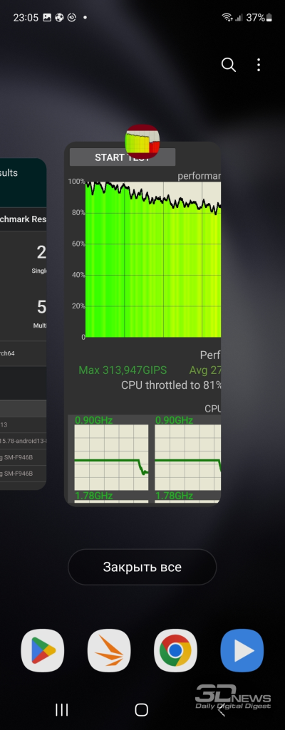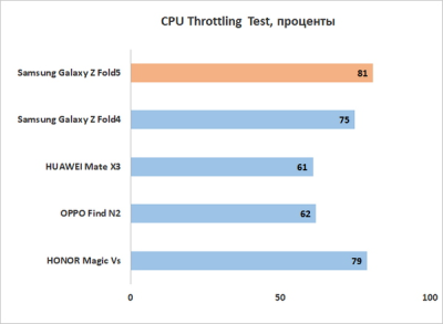 Казалось бы, в результате следовало ожидать серьезных проблем с перегревом или хотя бы заметного троттлинга. И да, корпус под нагрузкой действительно нагревается — но не так серьезно, чтобы смартфон после получаса игры хотелось отложить в сторону из-за того, что он начал уже жечь пальцы. Троттлинг также фиксируется, но не столь значительный, как можно было ожидать. Ресурсные тесты из пакета 3DMark выявляют понижение частот максимум на 40 %, CPU Throttling Test – на 19 %. Да, смартфон троттлит, но даже меньше, чем среднестатистический соратник по Snapdragon 8 Gen 2, платформе весьма горячей.