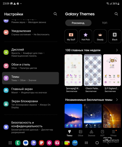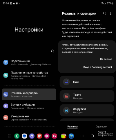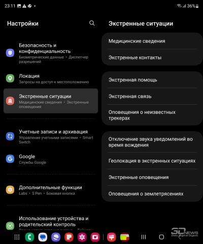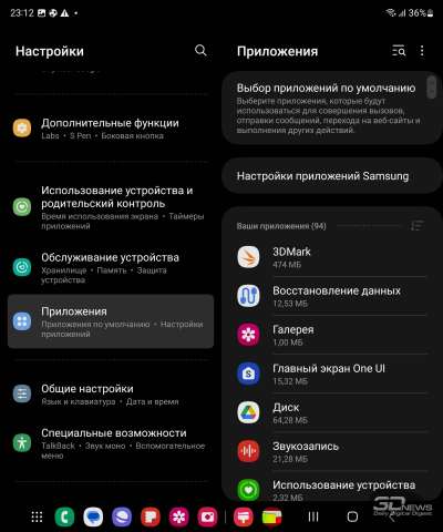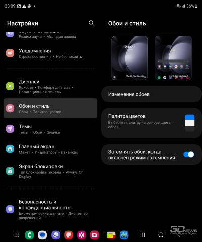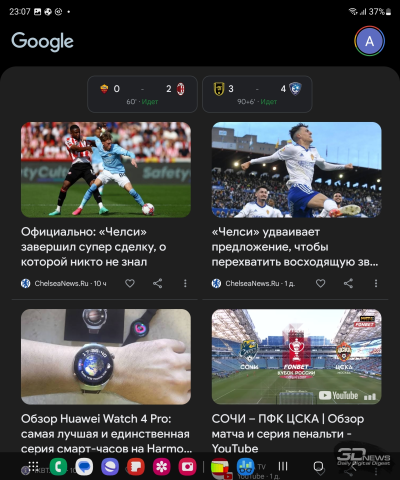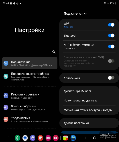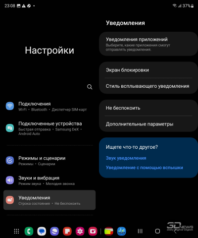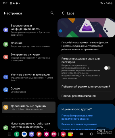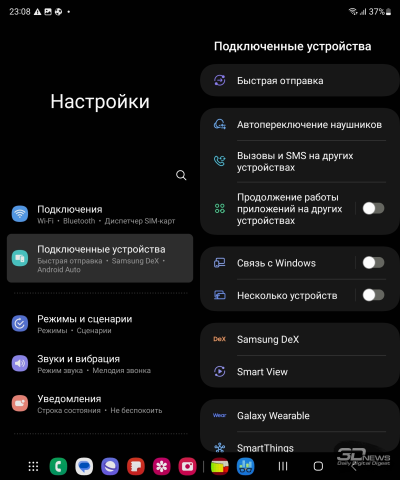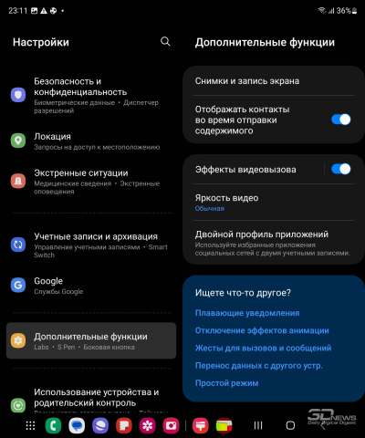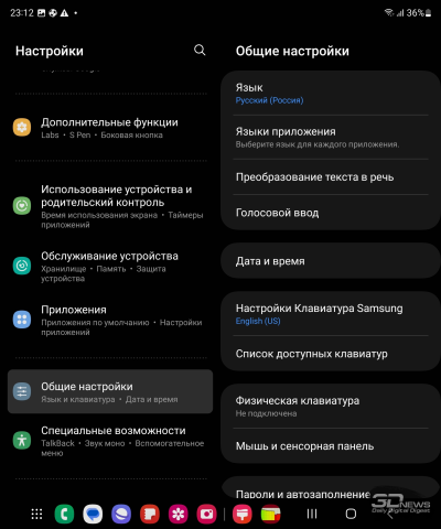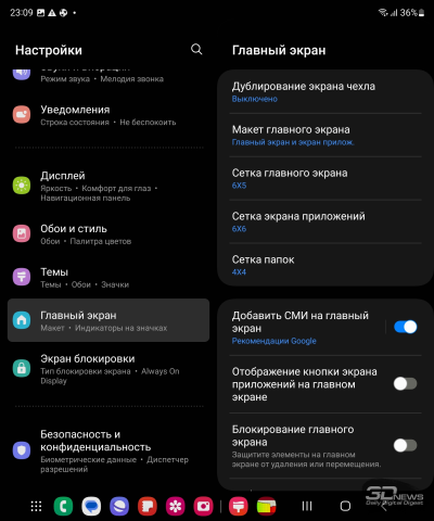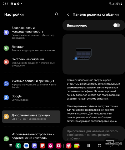 Это самая проработанная оболочка гибкого смартфона — с огромным отрывом от конкурентов. К вашим услугам бесшовное и мгновенное переключение приложений между внешним и внутренним экраном — причем они, как правило, отображаются на почти квадратном внутреннем экране без полей (у всех конкурентов с этим похуже). На месте и разделенная на две части клавиатура в разложенном виде; и отображение некоторых приложений в «ноутбучном» формате; а также очень гибкие настройки интерфейса, причем раздельные для внутреннего и внешнего экрана. Никуда не делась нижняя панель быстрого доступа к ключевым приложениям, постоянно доступная на экране, когда вы находитесь в том или ином приложении — ее подавали как особенность именно L-версии Android, но, как видим, она сохранилась и просто в OneUI.