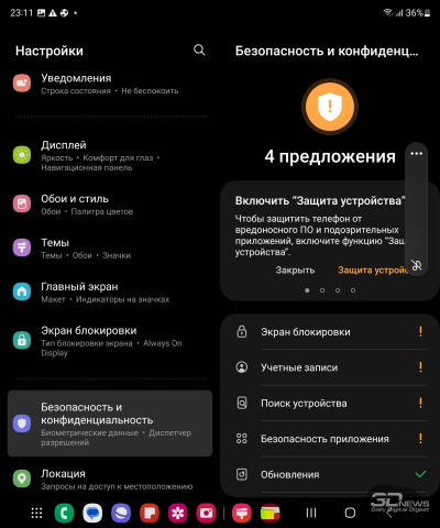 Смартфон работает под управлением Android 13 с фирменной оболочкой OneUI 5.1.1. Мы видим отсутствие литеры L в названии операционной системы — специальный «гибкий» Android стал эксклюзивом собственного складного смартфона Google. Но для пользователя не изменилось ничего, все основные сценарии взаимодействия с гибким Samsung на месте.