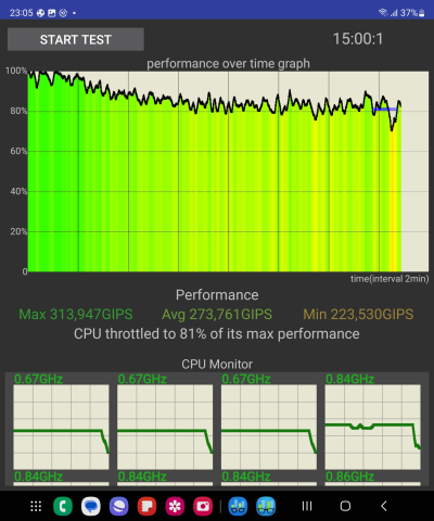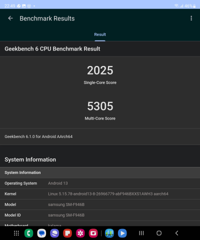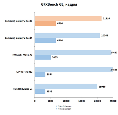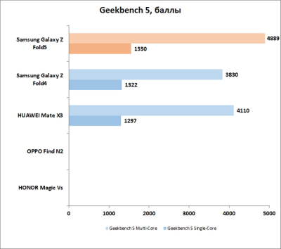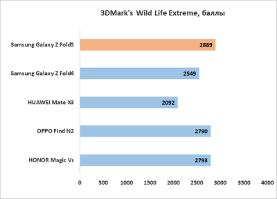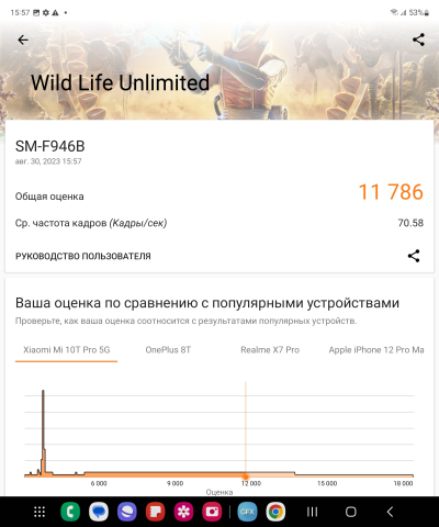 Как я недавно рассказывал в обзоре Samsung Galaxy Z Flip5, гибкие смартфоны из-за тонкого корпуса и специфической компоновки элементов больше подвержены перегреву и вынуждены порой более активно прибегать к троттлингу под нагрузкой. В Flip5 мы зафиксировали и понижение общей производительности системы, и серьезный троттлинг — производительность смартфона благодаря исчерпывающей мощи Snapdragon 8 Gen 2 все равно достаточна для флагмана, но некоторые проблемы в самых ресурсоемких приложениях возможны. Подобного стоило ожидать и от Galaxy Z Fold5, но в его случае производитель не стал понижать базовые частоты. В бенчмарках смартфон демонстрирует близкие к предельным на сегодняшний день цифры, жаловаться вообще не на что. Любые игры будут исполняться с максимальной доступной кадровой частотой, приложения открываться быстро, недостатка в скорости вы не почувствуете при любых раскладах.