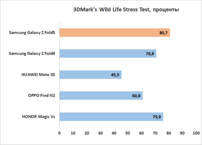 В нашем стандартном тесте с воспроизведением Full HD-видео на внутреннем экране с максимальной яркостью и включенным Wi-Fi Samsung Galaxy Z Fold5 продержался более 20 часов. При воспроизведении видео на внешнем дисплее батарея села чуть более чем за 23 часа. Оба результата крайне впечатляющие — именно как планшет Fold5 выглядит очень аппетитно, смотреть видео во время дальних перелетов/переездов на нем сам бог велел. Повторю сказанное выше — в оптимизации ПО Samsung нынче очень хороша.