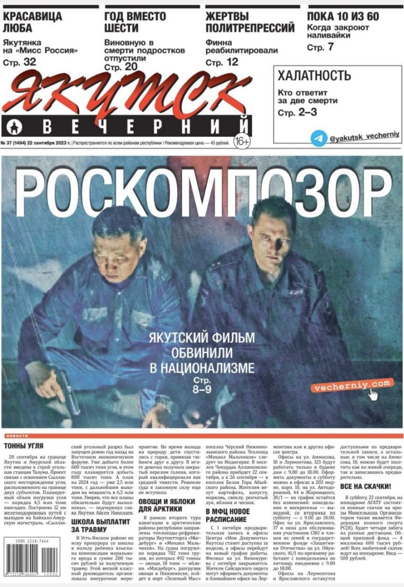 Новый номер регионального издания «Якутск вечерний» вышел с надписью «Роскомпозор» на первой полосе, где анонсируется материал на 8 и 9 страницах о том, что якутский фильм «Айта» обвинили в национализме.