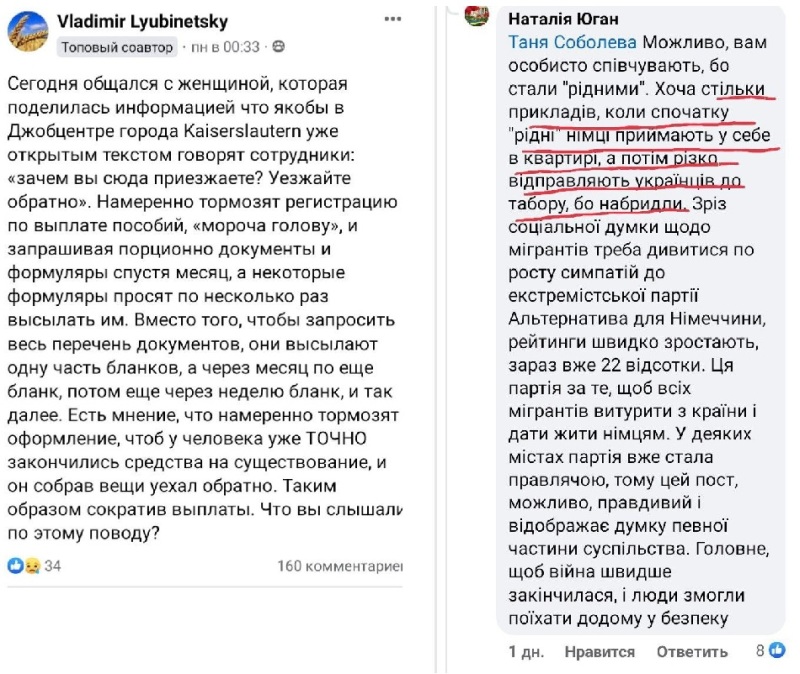 В Facebook «патриоты» уже жалуются, что сотрудники немецкого Джобцентра тормозят регистрацию на выплаты и открыто говорят, чтобы украинцы уезжали обратно на Украину.