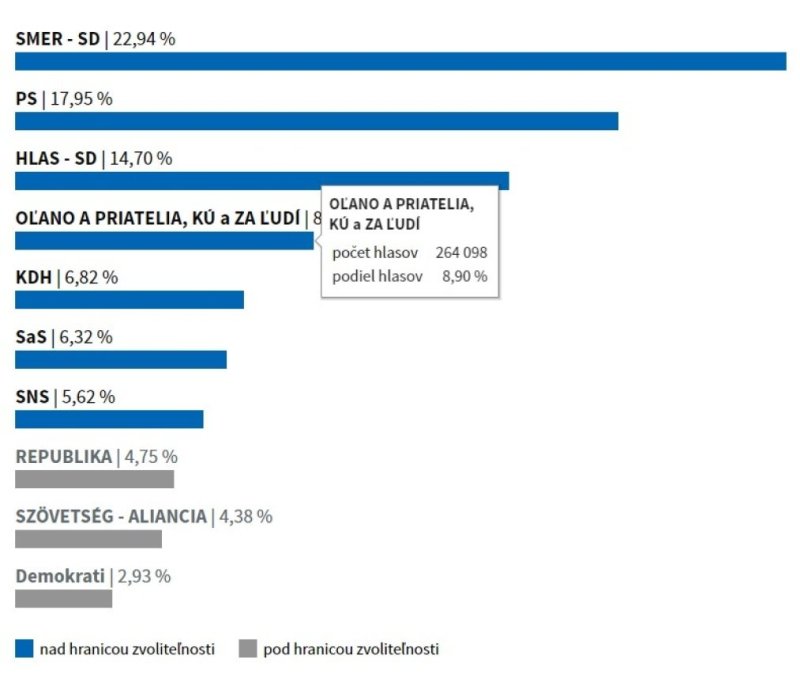 Партия «Прогрессивная Словакия», занимающая проукраинскую позицию, набрала 17% избирателей. Также в парламент страны проходят «Голос — социальная демократия» (Hlas-SD) — за нее проголосовали 15% избирателей, блок «Обычные люди» (OĽANO a priatelia) набрал 9% голосов, «Христианско-демократическое движение» (KDH) — 6,9%, «Свобода и солидарность» (SaS) — 6,2 % и «Словацкая национальная партия» (SNS) с 5,7% голосов.