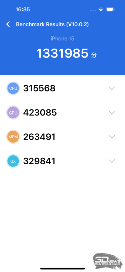 Но при длительных нагрузках рассчитывать на столь высокую производительность не приходится — процессор у iPhone 15 довольно быстро перегревается и начинает демонстрировать заметный троттлинг. В стресс-тестах бенчмарка 3DMark платформа Apple A16 Bionic сбрасывает частоты на величину до 12 % в более простом тесте Wild Life и на величину до 36 % в более суровом Wild Life Extreme. Замечу, что Apple, похоже, провела работу над ошибками, так как в iPhone 15 платформа троттлит слабее, чем в iPhone 14 Pro. Если судить по тактильным ощущениям, смартфон нагревается довольно сильно, но не экстремально, в руках держать его по-прежнему можно — троттлинг в данном случае выполняет свою функцию. В целом при работе устройство нагревается нечасто.