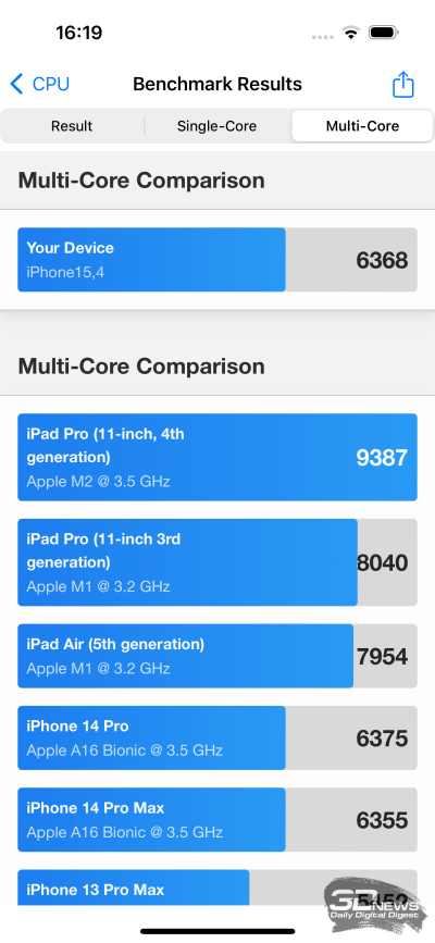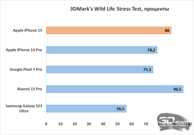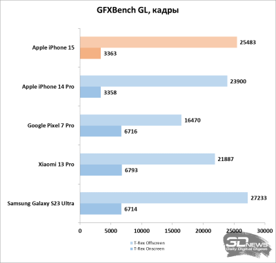 Что касается графической производительности, то здесь iPhone 15 в тесте 3DMark’s Wild Life Extreme оказался медленнее iPhone 14 Pro, а вот в GFXBench T-Rex выступает на равных. Отметим, что в результатах GFXBench следует ориентироваться на тест Offscreen, поскольку при рендеринге на экран iPhone упирается в лимит 60 FPS, установленный вертикальной синхронизацией. Если сравнивать с Android-смартфонами, то в плане графики iPhone 15 вполне в состоянии потягаться с актуальными флагманами на Snapdragon 8 Gen 2, например с Xiaomi 13 Pro.