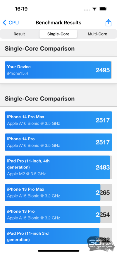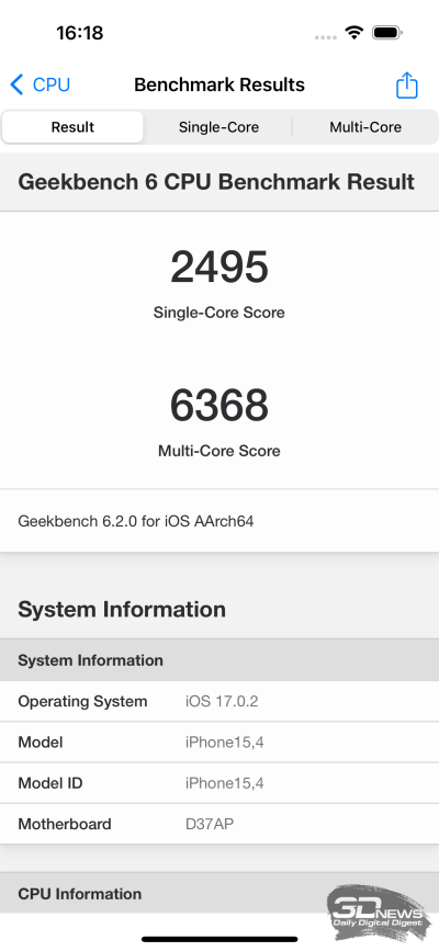 Вполне ожидаемо, iPhone 15 по производительности центрального процессора близок к iPhone 14 Pro, хотя и не во всех тестах. В Geekbench 6 результаты этих смартфонов оказались очень близкими, а в AnTuTu 10 так и вовсе новинка показала результат заметно выше прошлогоднего флагмана. Если же сравнивать с Android-смартфонами, то в тестах Geekbench 6 смартфону Apple просто нет равных — даже флагманы на Snapdragon 8 Gen 2 заметно отстают. А вот в AnTuTu смартфоны на Snapdragon 8 Gen 2 способны потягаться с iPhone 15.