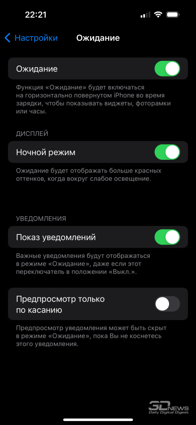 А ещё в iPhone 15 нет функции Always-On, которая осталась эксклюзивной для iPhone Pro, и это — тоже недостаток. Такое решение Apple выглядит особенно странным в контексте появления в iOS 17 режима «Ожидание», описанного в предыдущем разделе. Без Always-On теряется вся прелесть этой функции.