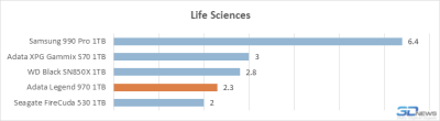 Бенчмарк SPECworkstation 3.1 оценивает производительность накопителей, моделируя нагрузки, характерные для рабочих станций. Такие нагрузки преимущественно состоят из мелкоблочных операций, причём с небольшой глубиной очереди запросов. В отсутствие линейных операций значение пропускной способности интерфейса здесь нивелируется, и результат Adata Legend 970 оказывается довольно скромным. Вычислительной мощности контроллера Phison E26 не хватает, чтобы сделать Adata Legend 970 хорошим вариантом для профессиональных применений, этот накопитель примерно того же уровня, что и PCIe 4.0-модели на контроллере Phison E18. Лучшим же SSD для рабочих нагрузок с большим отрывом остаётся Samsung 990 Pro.