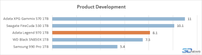 Новинка Adata проигрывает передовым накопителям прошлого поколения и по минимальной скорости записи. И это вновь можно списать на архитектуру массива его флеш-памяти, собранного из устройств NAND объёмом 1 Тбит. Модель SSD ёмкостью 2 Тбайт должна показать лучший результат.