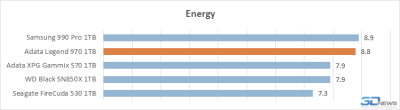 Сегодня же преимущества терабайтного Adata Legend 970 перед PCIe 4.0-конкурентами нагляднее всего проявились в синтетических тестах и при копировании файлов внутри SSD, когда возросшая пропускная способность интерфейса PCIe 5.0 заполняется несколькими одновременными потоками линейных операций. В реальных же сценариях, связанных с работой в приложениях или запуском игр, Legend 970 оказался примерно на одном уровне с флагманскими PCIe 4.0 SSD.