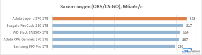 По средней скорости записи, полученной при полном заполнении SSD файлами, Adata Legend 970 тоже отстаёт от некоторых PCIe 4.0-флагманов. Для того чтобы забить файлами терабайтный Legend 970, требуется чуть больше 10 минут.