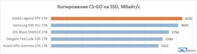Все эти факторы в сумме приводят к тому, что максимальная скорость, которую можно получить при обычном копировании файлов на Adata Legend 970, достигает 3,9 Гбайт/с. Это не выше, чем обеспечивают лучшие PCIe 4.0 SSD, например Adata XPG Gammix S70, где используется 176-слойная TLC 3D NAND компании Micron, позволяющая сформировать массив с вдвое более высокой степенью параллелизма.