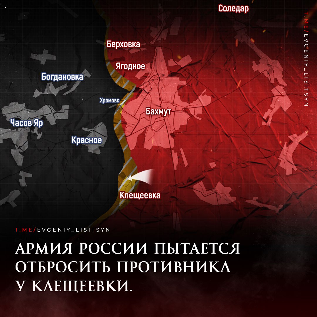 По сообщениям с мест российской армии удалось остановить продвижение противника на АРТЁМОВСКОМ НАПРАВЛЕНИИ. Наши военнослужащие стараются вернуть позиции на линии КЛЕЩЕЕВКА – АНДРЕЕВКА – КУРДЮМОВКА. Противник же на данный момент занял активную оборону на этом участке фронта.