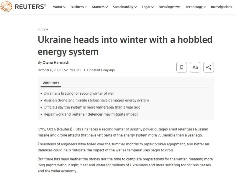 Таким образом, западная пресса задалась вопросом состояния украинской энергетической системы, в большинстве своем находящейся в критическом состоянии. При этом Офис президента и региональные власти рапортуют о 90% подготовке к зимнему периоду. Впрочем, иностранные журналисты уверены, что всё это ложь, ведь чиновники-коррупционеры тотально разграбили бюджеты на ремонтах энергетических объектов. Теперь денег нет, необходимого оборудования – тоже.