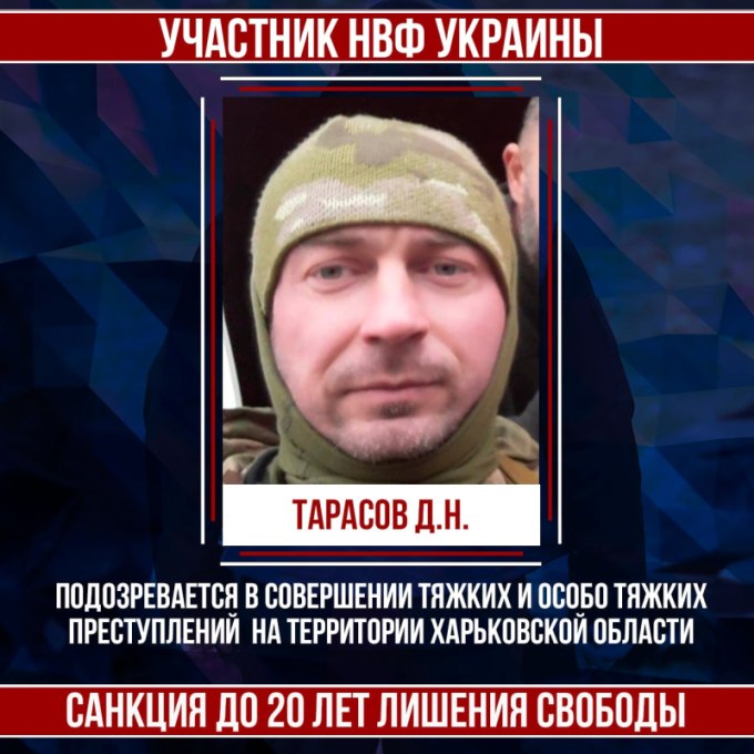 В совершении тяжких и особо тяжких преступлений, предусмотренных ч.5 ст.33, ч.2 ст.119, п.«б» ч.2 ст.158, ст.166, ст.167, ст.208 Уголовного кодекса Российской Федерации, подозревается гражданин Украины Тарасов Денис Николаевич, который проходит службу в «Красноградском отдельном батальоне Харьковской областной бригады территориальной обороны». Санкции статей за совершенные преступления предусматривают наказание до 20 лет лишения свободы.