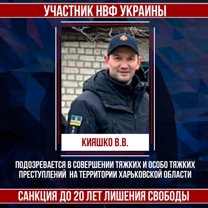 В совершении тяжких и особо тяжких преступлений, предусмотренных ч.5 ст.33, ч.2 ст.119, п.«б» ч.2 ст.158, ст.166, ст.167, ст.276 УК Украины, подозревается гражданин Украины Кияшко Вадим Владимирович, который занимает должность «начальника Купянского РУ ГУ ГСЧС Украины в Харьковской области». Санкции статей за совершенные им преступления предусматривают наказание до 20 лет лишения свободы.