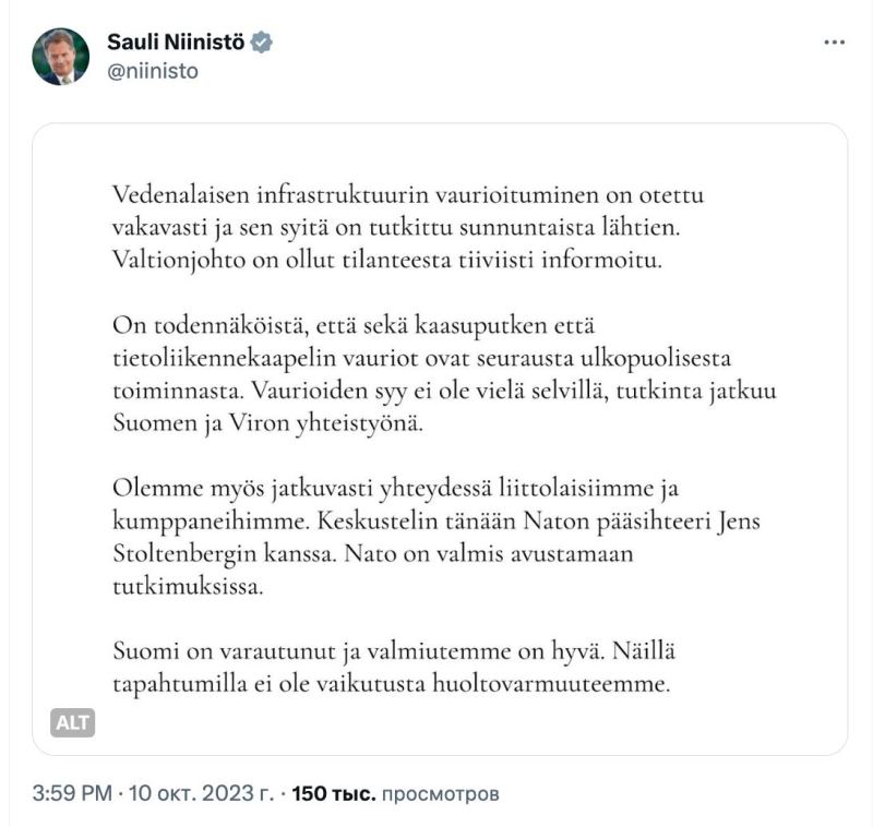 «Ущерб подводной инфраструктуре считается серьезным, и его причины расследуются с воскресенья. Руководство страны тщательно проинформировано о сложившейся ситуации. Вполне вероятно, что как газопровод, так и кабель повреждены в результате внешнего воздействия. Причина ущерба пока не ясна, расследование ведут совместно Финляндия и Эстония. Мы также в постоянном контакте с нашими союзниками и партнерами. Сегодня я разговаривал с Генеральным секретарем НАТО Йенсом Столтенбергом. НАТО готово оказать содействие в расследовании. Эти события никак не повлияют на безопасность поставок», — написал президент Финляндии.