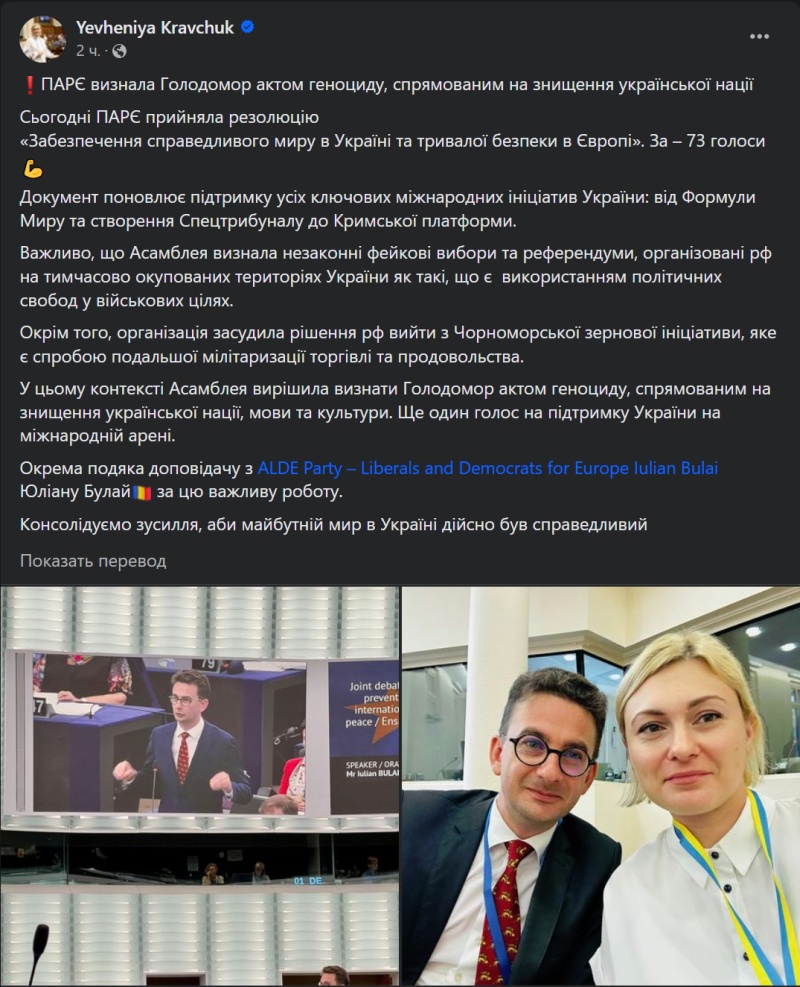 «Важно, что ПАСЕ также призвала все парламенты государств-членов Совета Европы и другие парламенты последовать этому примеру. Это правильно с моральной, исторической и политической точек зрения», — добавил глава МИД Украины Дмитрий Кулеба.