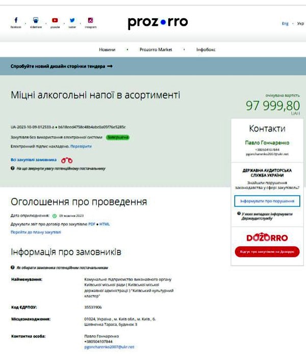 9 октября этого года тендер был опубликован на сайте Prozorro, и в этот же день нашелся победитель — ООО «Приват-Алко Трейдинг». Компания предложила выполнить условия тендера за 97 999 тысяч гривен.
