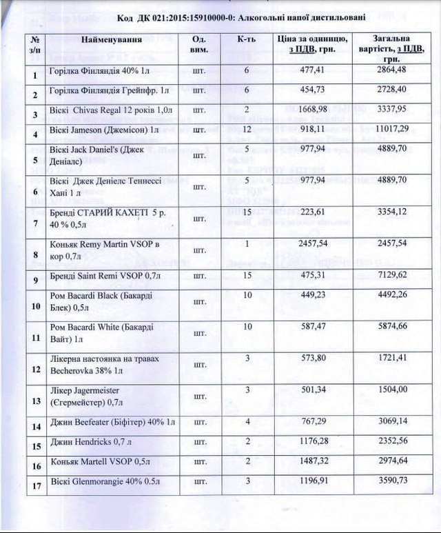 Согласно перечню, заказчик должен получить водку, виски 12-летней выдержки, коньяки и другие напитки.