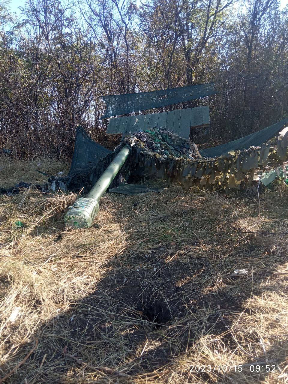 Как сообщает автор фото, по данной ложной цели сначала работала 155-мм ствольная артиллерия ВСУ осколочно-фугасными и даже кассетными боеприпасами, а окончательно добивать макет послали дрон «Баба-Яга» с бомбами ПТАБ-2,5КО.
