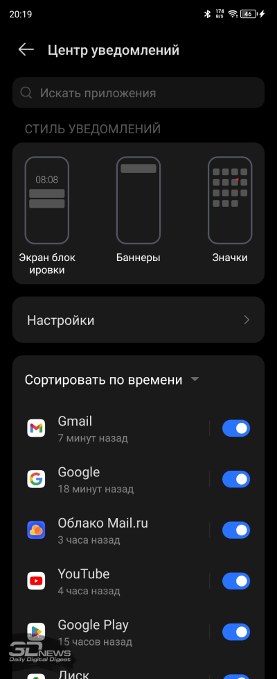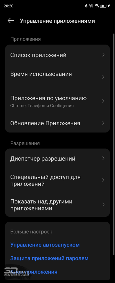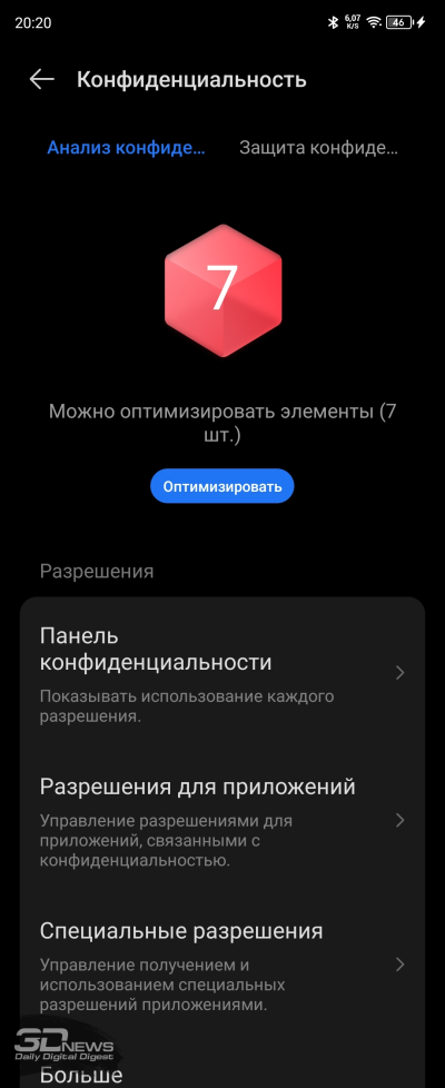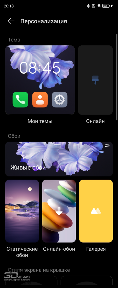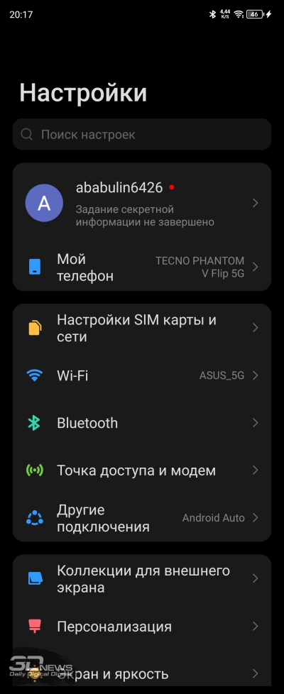 Настроек дисплея немного: яркость (в том числе адаптивная яркость); режим «защиты зрения» с теплыми цветами, который уместно включать перед сном; темная тема с возможностью настроить расписание ее работы; размер шрифтов; режим «В кармане», в котором снижается чувствительность сенсорного слоя дисплея во избежание случайных действий с ним. Доступен режим Always-On Display для внешнего экранчика с расширенными настройками, про него я уже рассказывал выше.
