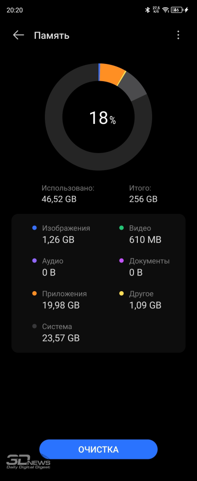 Одна из главных проблем использования платформы не самого высокого уровня — не ее «голая» производительность, а отсутствие поддержки самой быстрой памяти, что больше бьет по ощущениям от использования, чем недостаток чистой вычислительной мощи. В смартфоне установлено 8 Гбайт оперативной памяти LPDDR4x и 256 Гбайт энергонезависимой стандарта UFS 3.1. Слот для карты памяти отсутствует, а вот оперативную память можно расширить за счет накопителя на 8 дополнительных гигабайт.