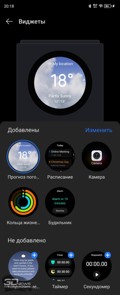 При горизонтальном смахивании можно увидеть виджеты. По умолчанию это погода, календарь, камера (при нажатии на значок открывается упрощенный видоискатель и можно снимать себя на тыльную камеру), «круги активности» (шаги, сожженные калории, время, проведенное в движении) и будильник. Также при желании можно добавить таймер, секундомер, диктофон и виджет, отображающий время восхода и заката, ну и рекомендующий солнцезащиту, если это требуется. Да, возможности внешнего экрана строго ограничены, но все же какую-то функциональность он сохраняет — это не бессмысленная декоративная деталь.