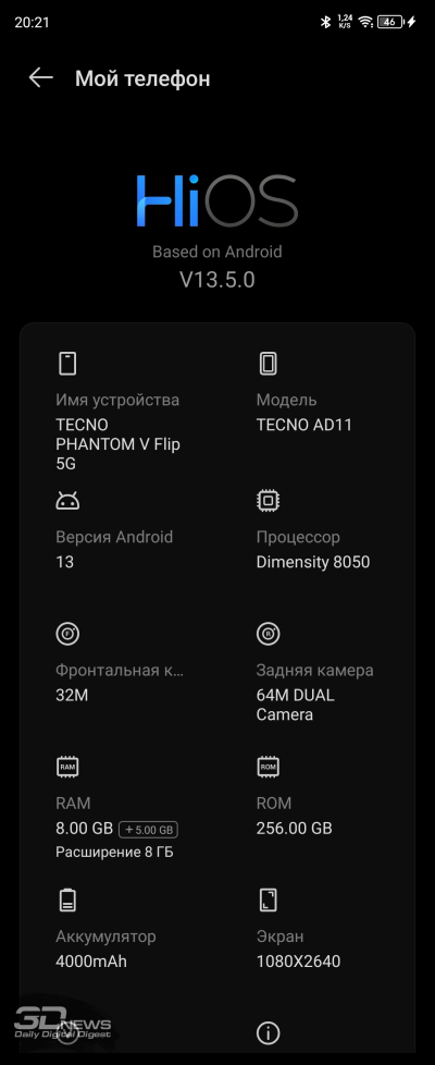 С одной стороны, TECNO PHANTOM V Flip получил достаточно свежую аппаратную платформу. С другой стороны, эту же аппаратную платформу мы видели до этого в смартфонах совсем иной ценовой категории, около 30-35 тысяч рублей – TECNO CAMON 20 Premier 5G и Infinix NOTE 30 VIP. Речь о MediaTek Dimensity 8050, переименованной Dimensity 1300.