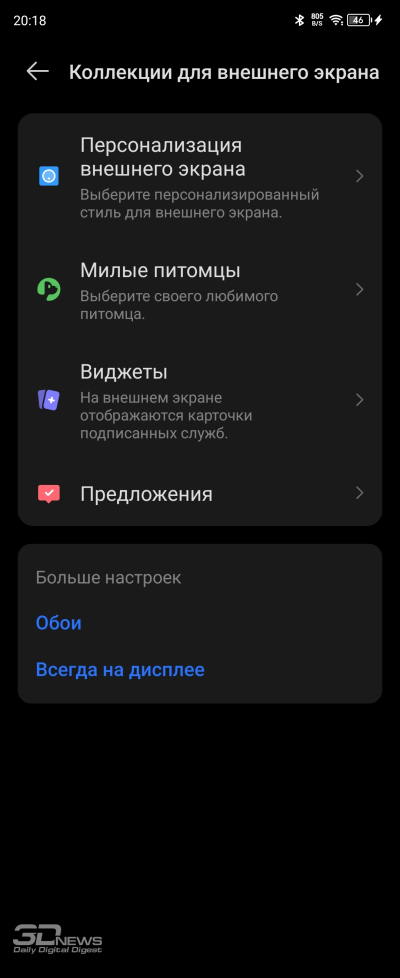 Но какие-то вещи все же добавлены. Главная — это, конечно, виджеты для внешнего экранчика. По умолчанию он работает в отлично знакомом почти всем пользователям современных смартфонов режиме Always-On Display, отображая время, заряд и значки уведомлений. Стоит взять телефон в руки, как на экране появляется маскот или отображается какая-то анимация — вы сами выбираете в настройках, что вы хотите видеть. Можно оставить все в минималистичном ключе, без анимаций.