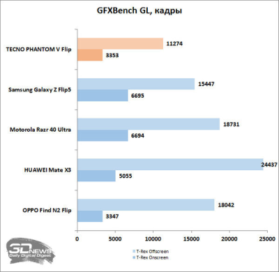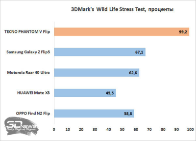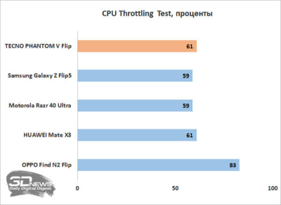 А вот троттлинг есть, и весьма заметный — бич складных смартфонов с их безумной плотностью расположения элементов в корпусе не миновал и TECNO PHANTOM V Flip.
