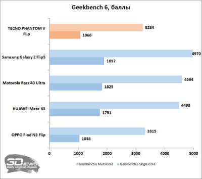 На самом деле характеристики платформы весьма серьезные. Да, сравнение в мощи с другими складными конкурентами TECNO PHANTOM V Flip не выдерживает — просто потому, что все они получили флагманские платформы: как минимум от той же MediaTek, как OPPO Find N2 Flip, как максимум — мощнейшую Snapdragon 8 Gen 2. Но по факту в обычных задачах разница не чувствуется: система работает быстро, ничего не лагает. Да, в играх кадровая частота будет пониже, а камера обрабатывает фото, возможно, не так быстро, но общий уровень вполне достойный. Просто не флагманский, но и цена TECNO PHANTOM V Flip не флагманская.