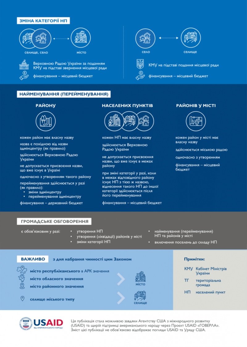 Согласно закону, все населенные пункты с компактной застройкой и населением более 10 000 будут иметь статус города. Населенные пункты с усадебной застройкой и населением более 5000 человек будут поселками.