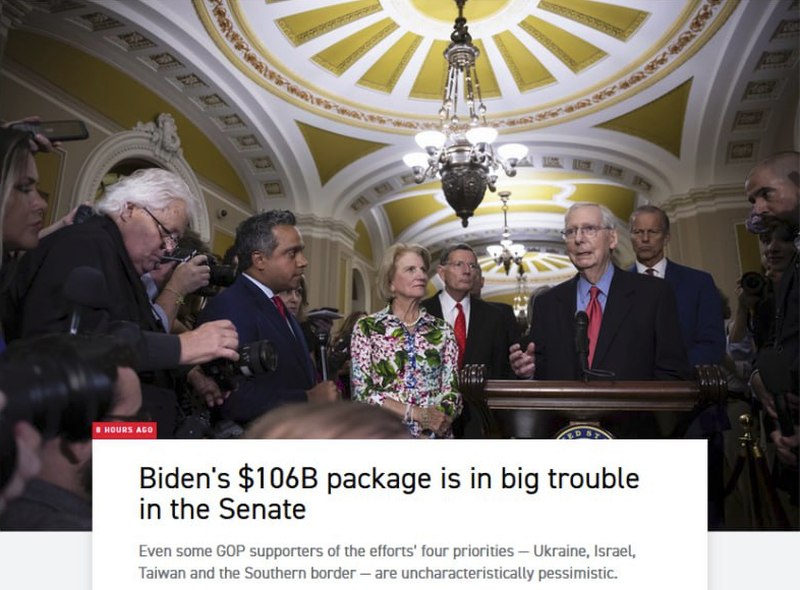 Издание Politico со ссылкой на свои источники сообщило, что запрос на оказание дальнейшей финансовой помощи Украине и Израилю может столкнуться с кардинальными изменениями или даже блокированием в Сенате Конгресса США.