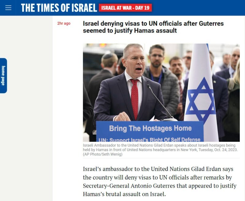 Постоянный представитель Израиля при ООН Гилад Эрдан призвал генерального секретаря всемирной организации Антониу Гутерриша оставить свой пост. Он утверждает, что позиция генсека ООН по палестино-израильскому конфликту не позволяет ему занимать эту должность. «Генеральный секретарь ООН, который проявляет непонимание по поводу кампании массовых убийств детей, женщин и стариков, не способен возглавлять ООН. Я призываю его немедленно уйти в отставку», — написал Эрдан на своей странице в социальной сети X (ранее Twitter).