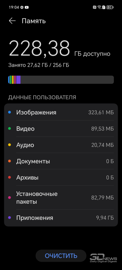 HONOR 90 Lite поставляется с 8 Гбайт оперативной памяти LPDDR4x и накопителем на 256 Гбайт (версию выяснить не удалось, скорее всего — UFS 2.2, это максимум, который поддерживает платформа). Отмечу, что оперативную память можно расширить за счет накопителя, «отъев» у него до пяти дополнительных гигабайт, пусть и более медленных. А вот энергонезависимую память расширить нельзя – слот для карты памяти отсутствует.
