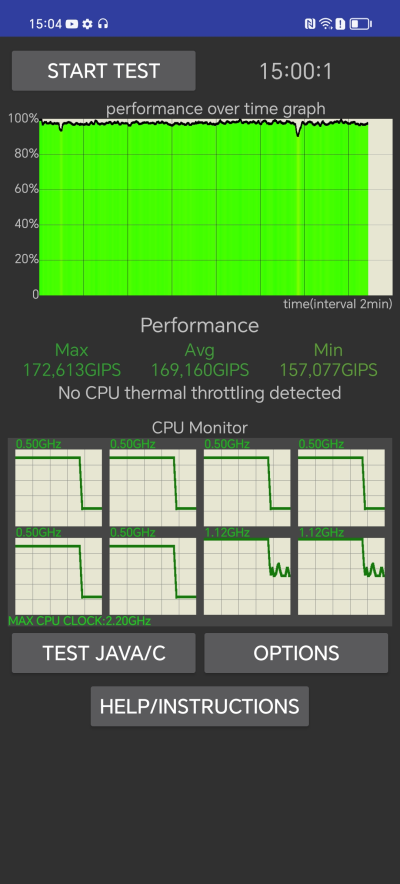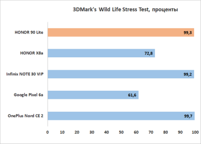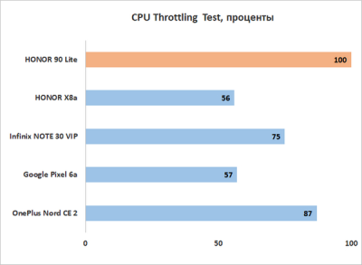 А вот троттлинга просто нет – смартфон вообще не греется под нагрузкой, а платформа никак не сигнализирует о долгой нагрузке. Ресурсные тесты не фиксируют понижения тактовой частоты.